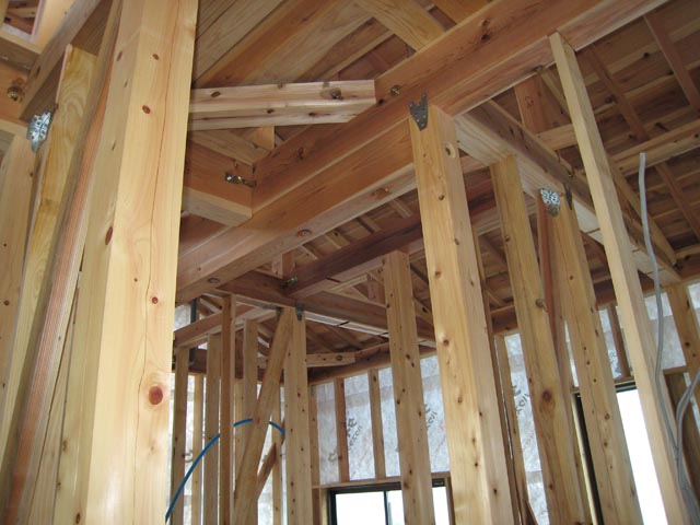 | 構造材 | 建築物の構造部分や土木構造物を構成する建築材料で,建築物のなかで荷重に抵抗して建物に剛性と強度を与える柱,大梁,小梁等の事です |